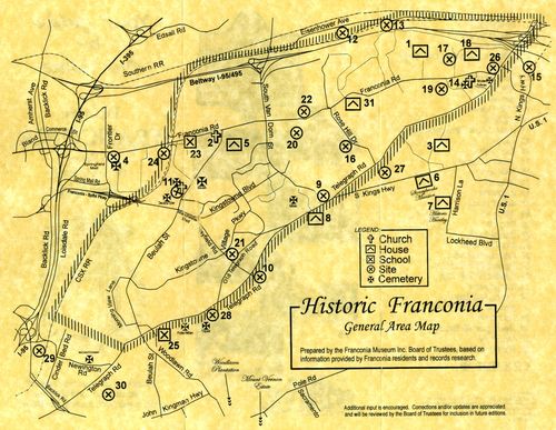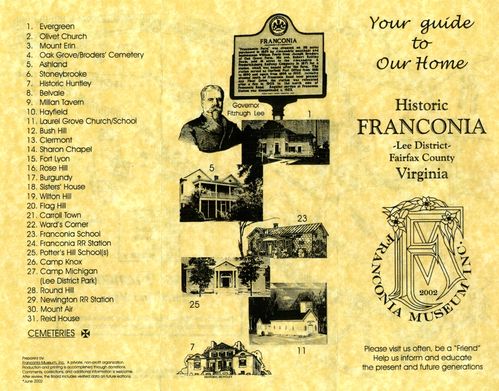24 Franconia Station. Built in 1872 when the RF&P railroad was extended from Aquia Creek north to Washington. The station took its name from the Franconia farm of R.R. Fowle, whose land it crossed. Until service was discontinued in the early 1950's the station and successor structures served an important role for commuting residents who worked in Washington. Located on Franconia Station Lane.